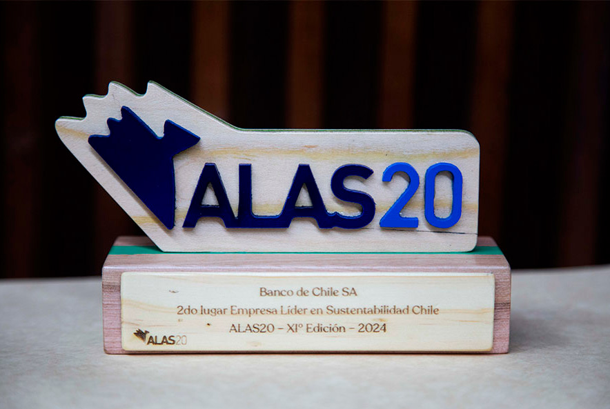En esta oportunidad la entidad financiera obtuvo el segundo lugar en el Premio ALAS20 Chile 2024, en la categoría Empresa Líder en Sustentabilidad. El reconocimiento fue entregado en el marco del IV Congreso Hispanoamericano de Inversión Responsable, que se realiza esta semana en nuestro país, y fue recibido por María Victoria Martabit, gerente de Asuntos Corporativos y Desarrollo Sostenible de Banco de Chile.