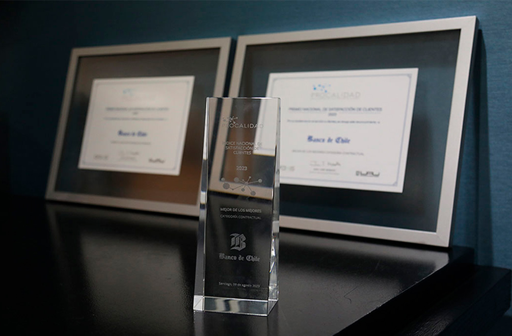 Banco de Chile recibe doble reconocimiento en Premio Nacional de Satisfacción de Clientes PROCALIDAD 2023: “Mejor de los Mejores” en la categoría Contractual y primer lugar en el sector Instituciones Financieras Grandes