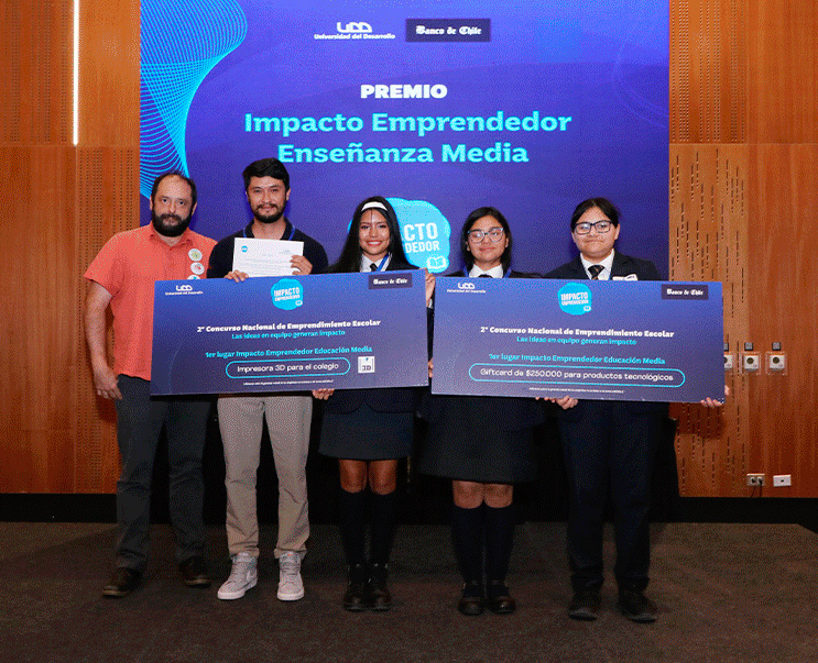 Santiago, 14 de diciembre de 2023.- Por segundo año consecutivo, Banco de Chile y su programa Pymes para Chile, junto a la Universidad del Desarrollo (UDD), llevaron a cabo el Concurso Nacional de Emprendimiento Escolar Impacto Emprendedor. La iniciativa tiene como objetivo promover el emprendimiento en edad temprana, impulsar el desarrollo de habilidades para la formación de agentes de cambio y fomentar el trabajo colaborativo. Esta edición recibió cerca de 400 postulaciones, de 118 instituciones educacionales públicas y privadas de todo el país.