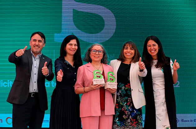 La ceremonia de premiación contó con la participación de Paola Alam, gerente de la División Riesgo Crédito Mayorista; María Victoria Martabit, gerente de Asuntos Corporativos y Desarrollo Sostenible, y Sebastián Torrens, gerente de Desarrollo Empresas y Pyme, todos de Banco de Chile.