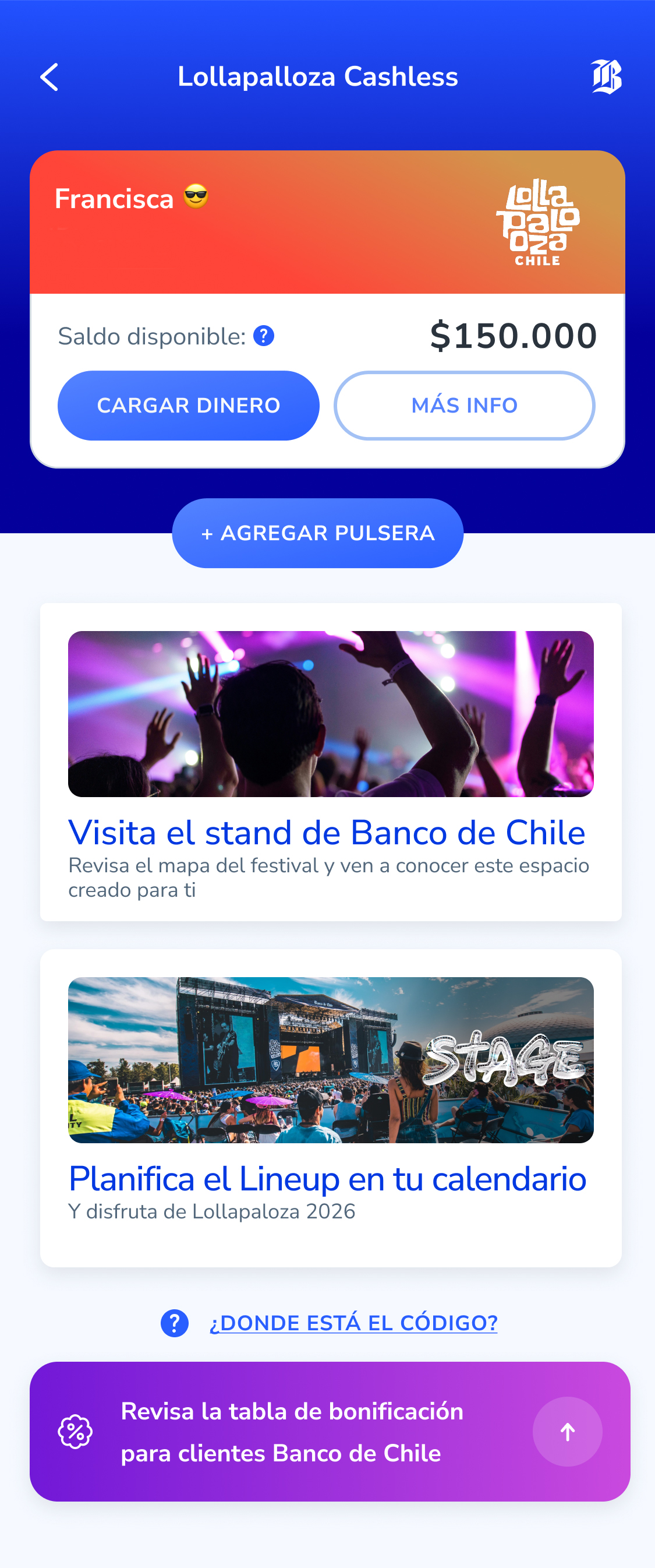 Luego de cuatro ediciones en el Parque Bicentenario de Cerrillos el evento regresa al Parque O’Higgins en Santiago Centro. Lolla 2026 se realizará el viernes 13, sábado 14 y domingo 15 de marzo y congregará miles de amantes de la música y la entretención. Para usar estas funcionalidades, los clientes de Banco de Chile —entre ellos los más de 2 millones de Cuenta FAN— y Banco Edwards deben descargar desde App Store o Google Play la app Mi Banco.