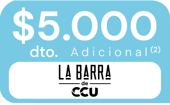 (2) Promoción válida desde el 01 al 31 de diciembre 2025 para clientes que paguen con Tarjeta de Débito o Crédito del Banco de Chile (Incluye Banco Edwards) a través del Botón de Pago Banco de Chile e ingresen código de descuento señalado en ésta comunicación. El beneficio es válido dentro de la cobertura de despacho de productos que corresponde a la Región Metropolitana, I, II, III, IV, V, VI, VII, VIII, IX, X, XIV, XV y XVI región. El catálogo de productos rebajados, la venta, la calidad y disponibilidad de los productos, las campañas especiales a precios rebajados de productos adquiridos en el catálogo son de exclusiva responsabilidad de CCU S.A. Todo lo anterior sin responsabilidad alguna para Banco de Chile en ello, ni en la ulterior atención que ello demande.
